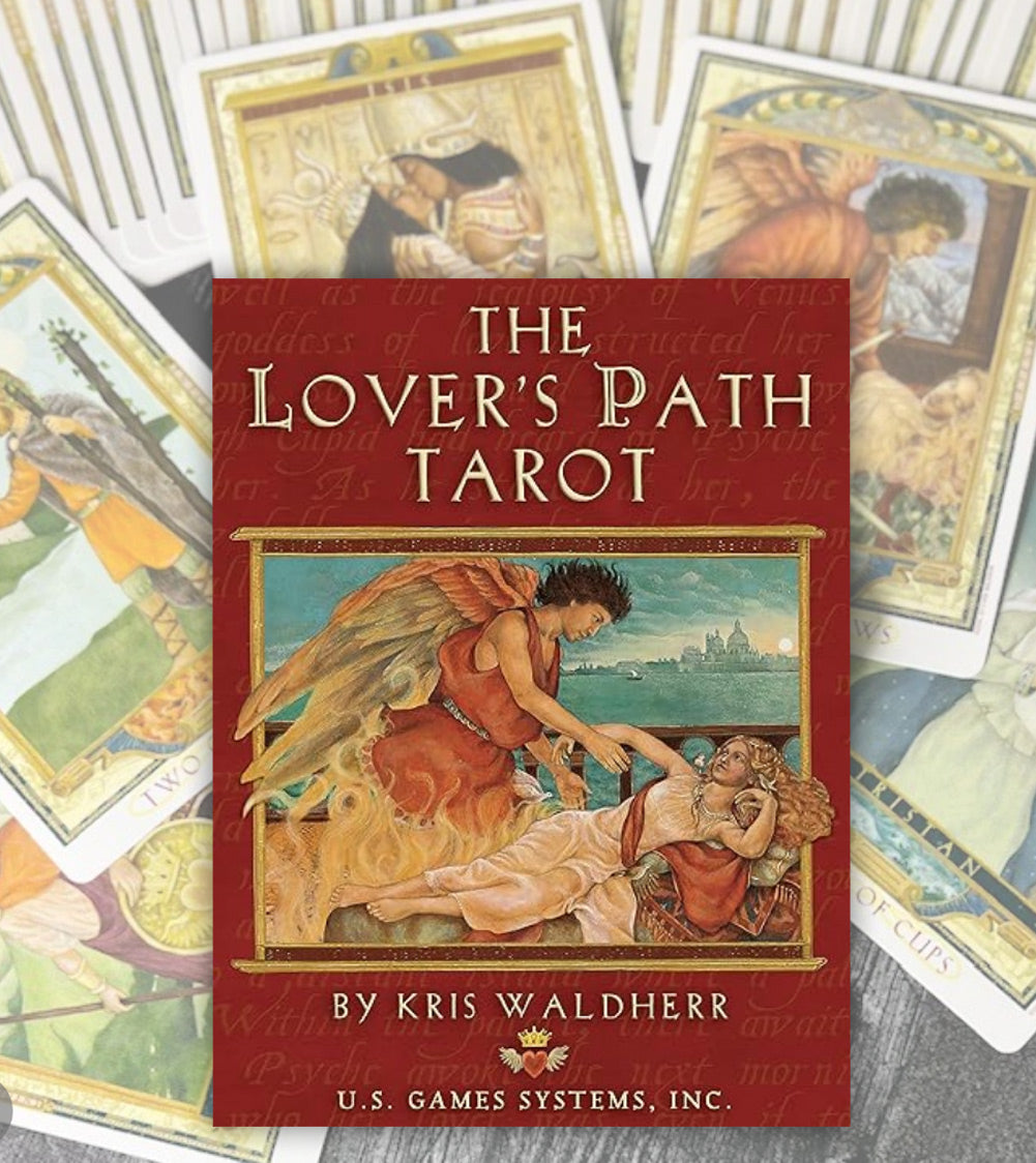 ABOUT THE LOVER'S PATH TAROT: Praised as the most romantic tarot deck ever created, The Lover's Path Tarot features 22 famed lovers from history and mythology ranging from Tristan and Isolde to Romeo and Juliet. 78 card deck, instruction booklet, layout sheet in a gift box. Deck available from BookShop.org.